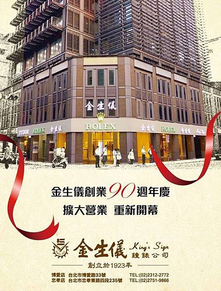 創立於1923(民國12)年,迄今已近90年的悠久歷史,永續服務是金生儀鐘錶董事長陳榮垣先生的信念,經營哲學則本著專業、至誠、負責的態度作為經營圭皋,享譽於世界鐘錶圈,現有西區博愛路創始店、東區忠孝東路旗艦店。